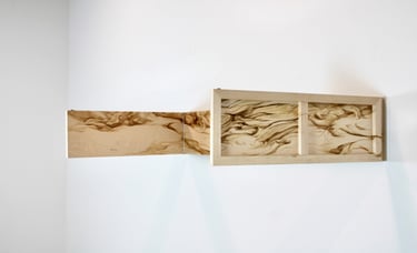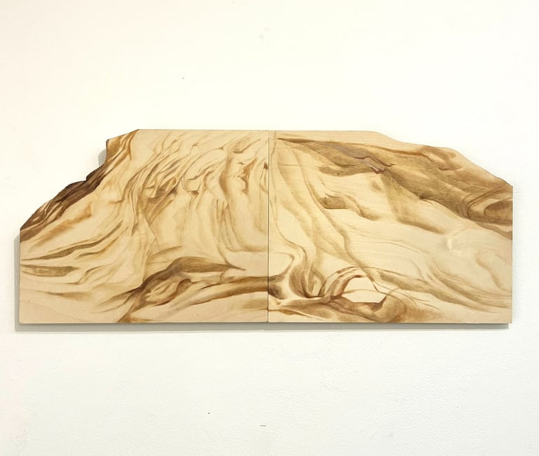 The plywood grain, a fiction of nature, bears within it the residue of something it no longer is. A simulated memory of growth, pressed and repeated, it parades as natural while becoming fundamentally artificial. And yet, it is this illusion—this industrial mimicry of organic form—that becomes the ground upon which painting begins.